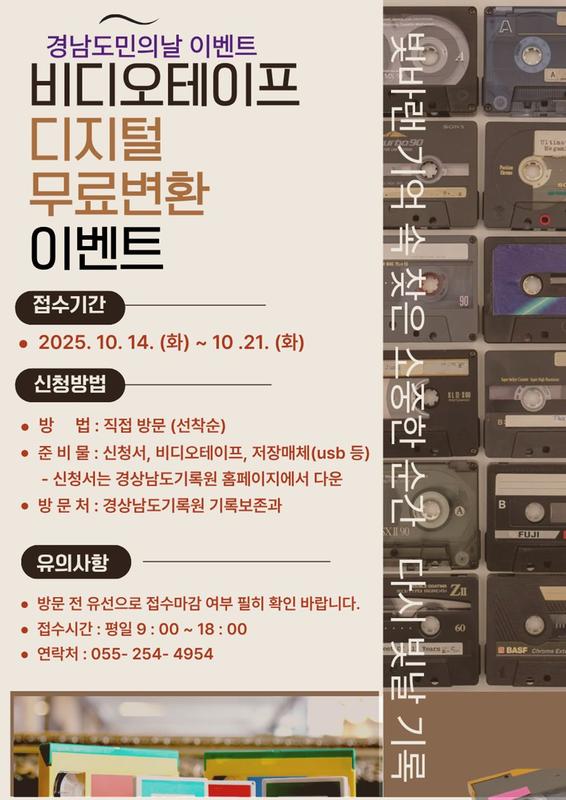 경상남도기록원은 시민들이 소중한 개인기록을 안전하게 보존할 수 있도록 ‘비디오테이프 디지털 변환 이벤트’를 운영했습니다.