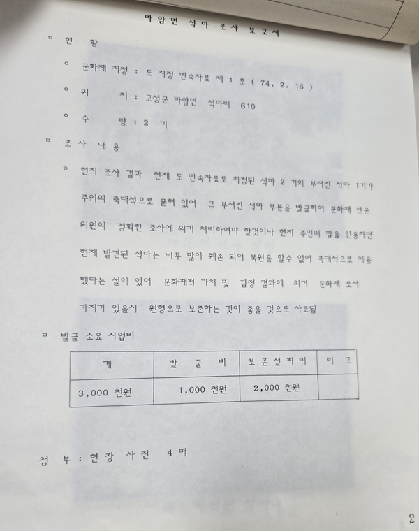 기록에는 석마(石馬)의 현 위치와 보존 상태를 고려해 원형을 유지하는 보존이 바람직하다는 판단이 담겨 있다. 「석마보수공사」 (고성군 문화관광과, 1992, 경상남도기록원 소장)