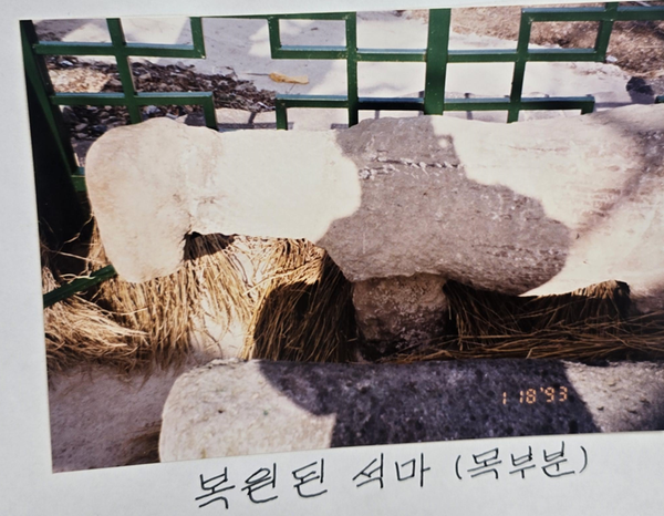머리와 몸체가 분리된 채, 말의 형상만이 남아 있었다. 「석마보수공사」 (고성군 문화관광과, 1992, 경상남도기록원 소장)